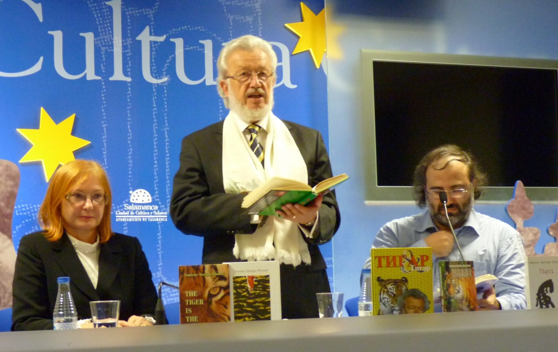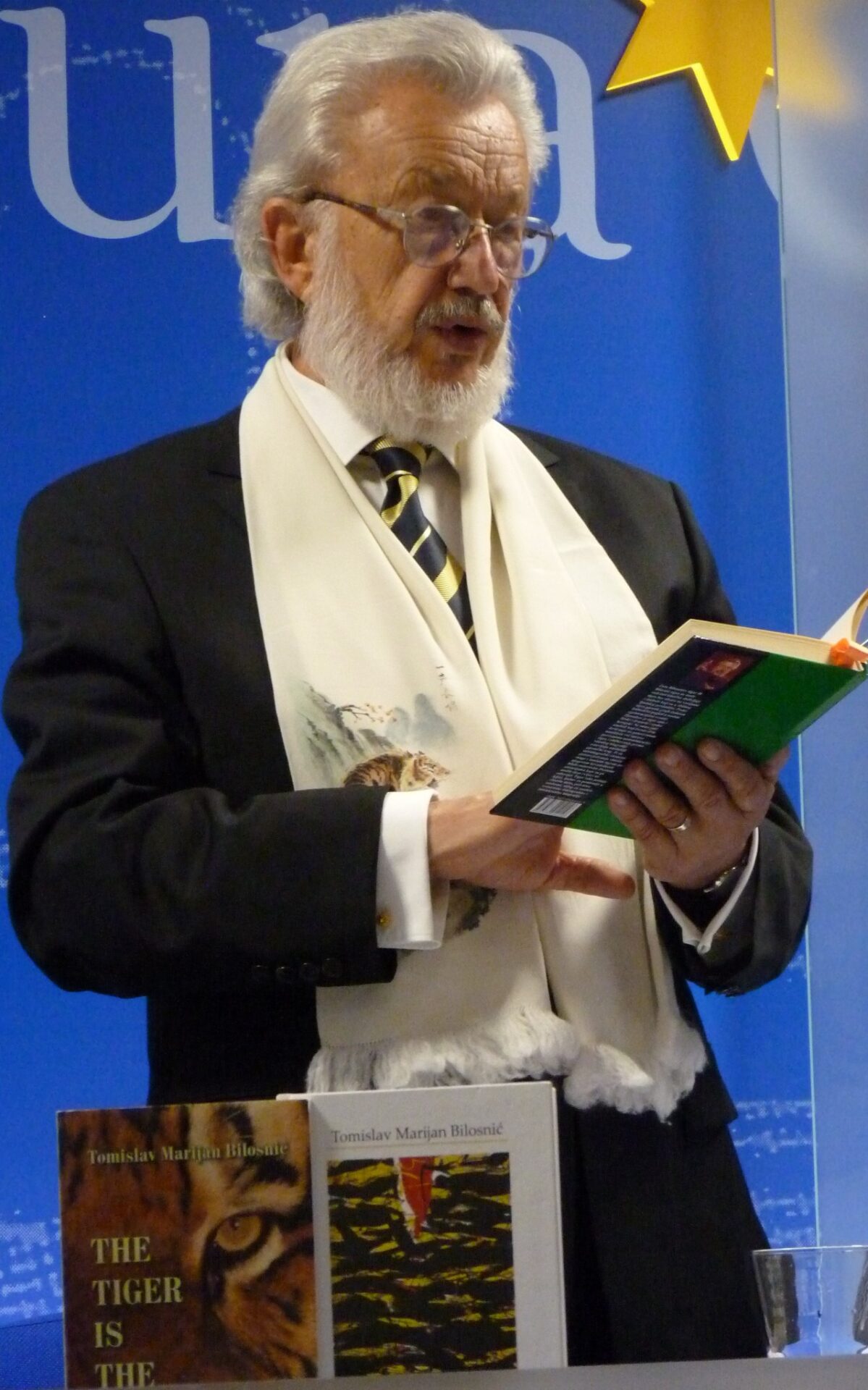 Crear en Salamanca tiene el privilegio de publicar por vez primera, tanto en croata como en español, cuatro textos que ha escrito el notable poeta Tomislav Marijan Bilosnić (Zemunik, 1947), tras su estancia en Salamanca el pasado 16 de septiembre. Aquí, en la Sala de la Palabra del Teatro Liceo, presentó su poemario ‘El tigre’ (Trilce Ediciones, Salamanca, 2015), acompañado por un grupo de poetas y rapsodas salmantinos que dieron su voz para la lectura de los versos: José María Sánchez Terrones, Elena Díaz Santana, Carmen Prada, José Amador Martín, Nines Moreno Plaza, Luis Frayle Delgado, Sofía Montero, Isaura Díaz Figueiredo, Francisco Javier Sánchez, Montserrat Villar, Juan Carlos López Pinto y Sol de Diego.