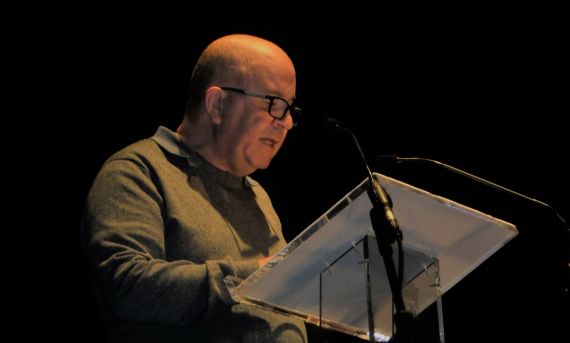 Victor Oliveira Mateus leyendo sus versos en el Teatro Liceo (2018, foto de Jacqueline Alencar)