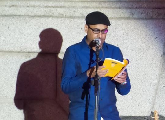 Ali Al Hazmi leyendo en la Plaza del Ayuntamiento
