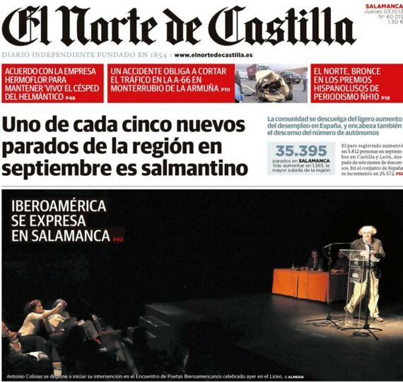 Lectura de Antonio Colinas en el Encuentro de 2013 (Portada de El Norte de Castilla)