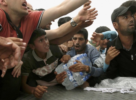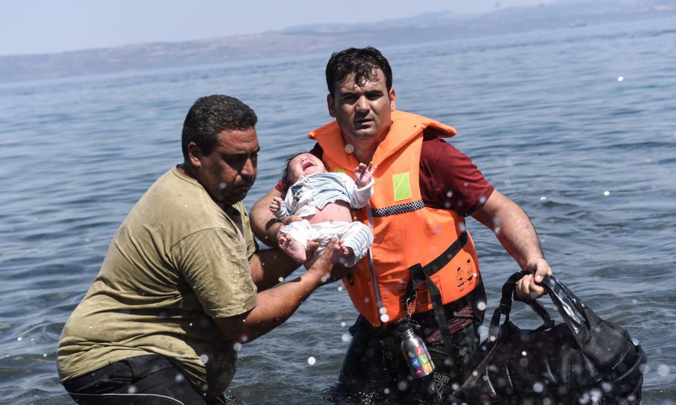 People welcome refugees with a banner reading ‘welcome to Germany’ in Dortmund, Germany, Sunday,