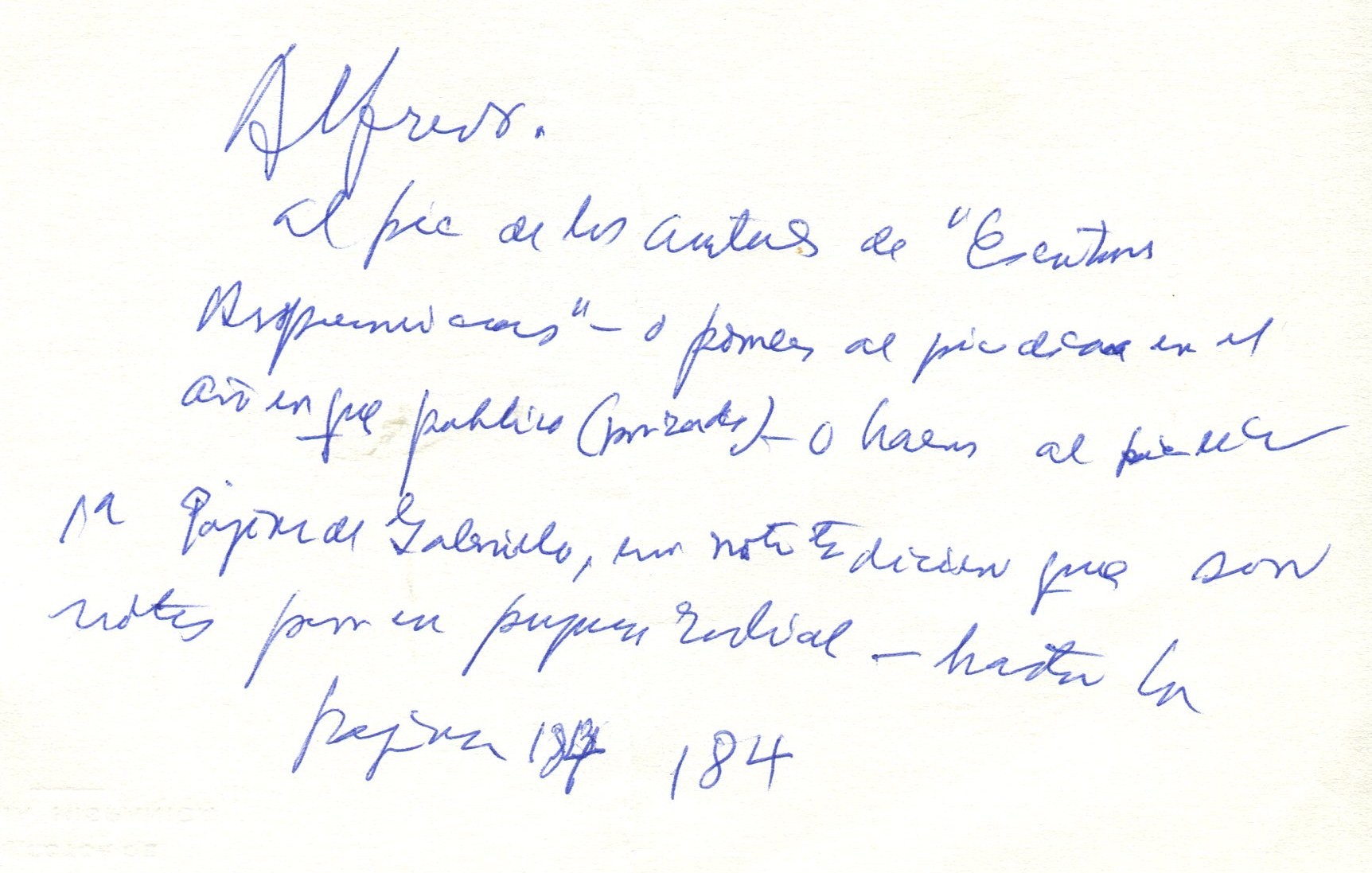 Manuscrito de Gastón Baquero dirigido a A. P. Alencart