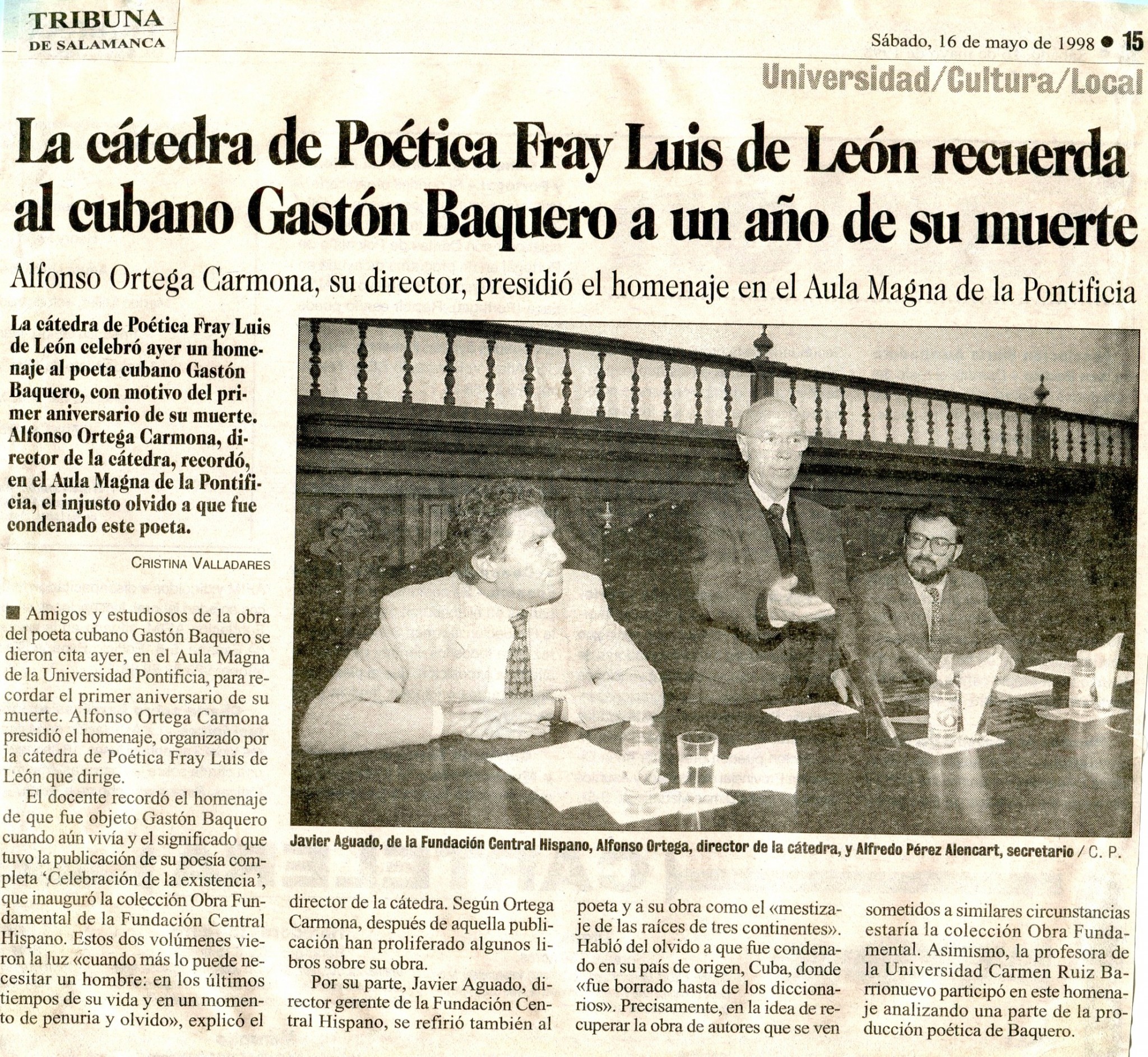 Crear en Salamanca tiene el privilegio de publicar, por vez primera, las bases del VIII Premio Internacional de Poesía Gastón Baquero, convocado por la Editorial Verbum de Madrid y por la Sociedad de Estudios Literarios y Humanísticos de Salamanca “Alfonso Ortega Carmona” (SELIH). Recordar que el XVII Encuentro de Poetas Iberoamericanos, celebrado en octubre de 2014, estuvo dedicado a conmemorar el primer centenario de uno de los más grande poetas de habla española, el cubano-español Gastón Baquero.