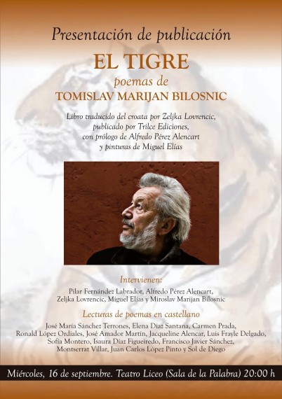 Crear en Salamanca tiene el privilegio de publicar por vez primera, tanto en croata como en español, cuatro textos que ha escrito el notable poeta Tomislav Marijan Bilosnić (Zemunik, 1947), tras su estancia en Salamanca el pasado 16 de septiembre. Aquí, en la Sala de la Palabra del Teatro Liceo, presentó su poemario ‘El tigre’ (Trilce Ediciones, Salamanca, 2015), acompañado por un grupo de poetas y rapsodas salmantinos que dieron su voz para la lectura de los versos: José María Sánchez Terrones, Elena Díaz Santana, Carmen Prada, José Amador Martín, Nines Moreno Plaza, Luis Frayle Delgado, Sofía Montero, Isaura Díaz Figueiredo, Francisco Javier Sánchez, Montserrat Villar, Juan Carlos López Pinto y Sol de Diego.