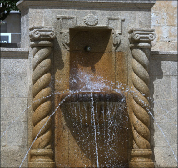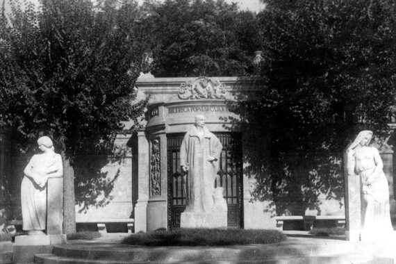 Sagrario chiquito de libros, estantería tallada en la piedra plateresca, es este rincón de piedra desgastada por el tiempo y la intemperie, un recuerdo dorado al sol de lo que nos hizo mejores, cultura abierta a la calle, parque de recreo infantil, libro de la mano abierto tras el juego. Junto a la fuente que mana y acaricia sin cesar la piedra, convertida en escalón que subir para seguir el parque y el paseo que fuera de claustros amantes del sosiego, jardineros del alma para arar el ora y el labora, la pequeña biblioteca, armarito de muñecas, se abre al recuerdo de la obra social, de la obra que calla y otorga. Hendida en el muro con el cincel de platería, filigrana de piedra suave al desgaste soleado, se descubre, inesperada, las pequeñas estanterías repletas, la reja guardando el secreto ornado de fantasía de cantero y cenefa de cincel. Es la pared que custodia la biblioteca de 1926, tiempo que pasa como el agua de la fuente que mana, piedra tallada donde leer la memoria recobrada.