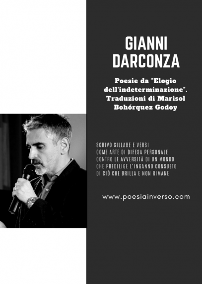 Crear en Salamanca tiene la satisfacción de publicar estos poemas de Gianni Darconza, poeta, narrador, traductor y profesor de Literatura y Cultura Española y Literaturas Comparadas en la Universidad de Urbino Carlo Bo (Italia). Ha publicado los poemarios Oltre la lastra di vero (2006, ganador del concurso “Jacques Prévert” 2006), Materia oscura (2017), Antipartículas ‑ Antiparticelle (2019, con la poeta colombiana M. Bohórquez), Elogio dell’indeterminazione (2019) y la colección de haikus Pensieri in forma khiusa (2020). Es autor de la novela Alla ricerca di Nessuno (2007), el libro de relatos L’uomo in nero e altre scorie (2009) y el cuento para la infancia Il ladro di parole (2013, ganador del Premio Frontino Montefeltro 2014), publicado en traducción española col el título El ladrón de palabras (Bogotá, 2019). Para la Editorial Raffaelli de Rimini ha traducido una Antologia di poesia breve latinoamericana (2015), Giovane poesia latinoamericana (2015), y La grande poesia ispanoamericana (2018), y varios libros y poemas de poetas latinoamericanos como Ó. Hahn, V. Huidobro, P. Neruda, N. Parra, A. Cisneros, M. A. Campos, V. Rodríguez Núñez, M. Bojórquez, R. Dalton, R. Courtoisie, F. Díaz Granados, M. Bohórquez, G. Gómez, A. Pérez Alencart, y de poetas españoles como A. Machado, M. Hernández, J. R. Ripoll, J. Bozalongo, B. Clark y R. Lanseros. Ha participado a los Festivales Internacionales de Poesía de Ciudad de México (2015), de Pereira (2016 y 2019), de Bogotá (2016), de Como (Italia, 2017) y de Craiova (Rumania, 2017). En 2018 ha recibido el Premio Elio Pagliarani de Traducción por el libro Arte di morire (2018) del poeta chileno Óscar Hahn, y en enero de 2020, en París, el Premio del Concurso Internacional de Poesía “L’amour de la nature” de la Académie Européenne des Sciences, des Arts et des Lettres (AESAL).