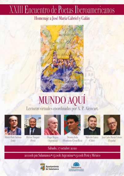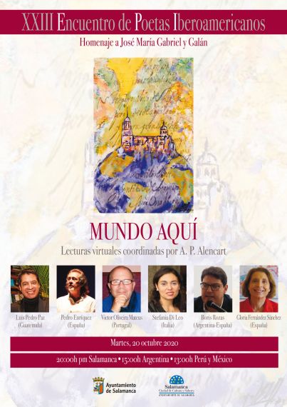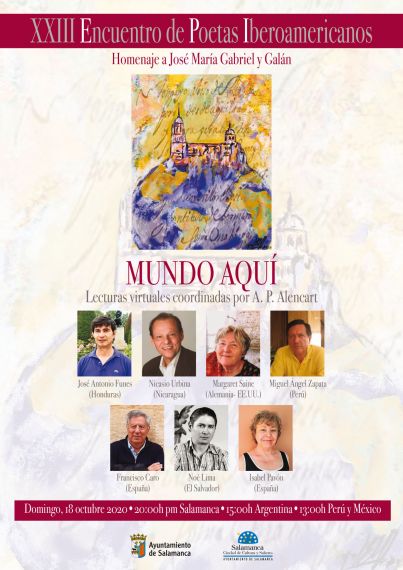 Desde hoy, a las 20,00 horas, y hasta el 20,comienzan las lecturas virtuales de la segunda parte del XXIII Encuentro de Poetas Iberoamericanos, organizado por la Fundación Salamanca Ciudad de Cultura y Saberes, dedicado a José María Gabriel y Galán. Estas poemas también saldrán publicados en la segunda antología del encuentro, titulada “Mundo Aquí”, también coordinada por el poeta peruano-salmantino Alfredo Pérez Alencart, director de estos encuentros desde su primera edición.