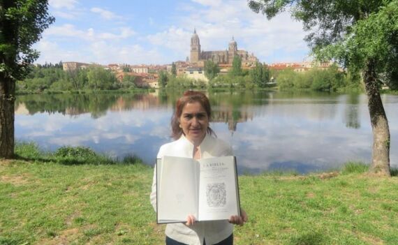 Jacqueline Alencar junto al Tormes y con su Salamanca de fondo, y en las manos un ejemplar de la Biblia del Oso, más conocida como Biblia Reina-Valera