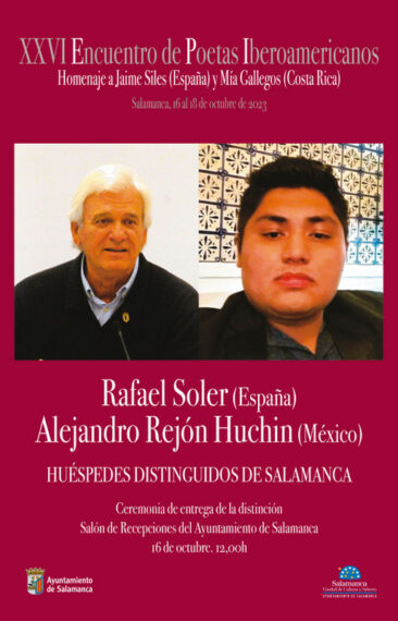 Los poetas Rafael Soler (España) y Alejandro Rejón Huchin (México) serán reconocidos como Huéspedes Distinguidos de Salamanca, dentro del acto de recepción de los poetas invitados. Será el día 17 a las 12,30 h. En dicha ceremonia también se entregará, al poeta Carlos López Degregori (Perú), la “Medalla Fray Luis de León de Poesía Iberoamericana”, que concede el Encuentro.