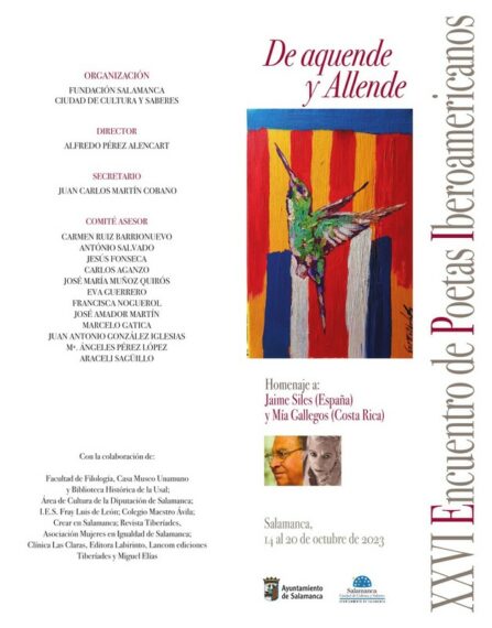 Si la edición pasada el encuentro se dedicó a celebrar la poesía de Ana María Rodas (Guatemala), Rosa Alice Branco (Portugal) y Daisy Zamora (Nicaragua), además de celebrar la designación de Salamanca como Capital Cultural Europea, en esta edición se celebrará la poesía del valenciano Jaime Siles y de la costarricense Mía Gallegos. Para ello también se ha publicado la atractiva antología ‘De aquende y allende’, con textos selectos de los dos homenajeados, los cuales fueron seleccionados por Pérez Alencart. También incluye poemas de otros setenta y ocho poetas de España, Portugal Iberoamérica y otros países, como Italia.