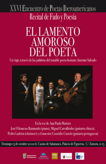 El Casino de Salamanca acogerá el concierto de Fado y Poesía, titulado “El lamento amoroso del poeta. Un viaje a través de las palabras del notable poeta lusitano António Salvado”, en la voz de Ana Paula Martins y el acompañamiento de los músicos José Filomeno Raimundo, Miguel Carvalhinho, Pedro Ladeira y Custódio Castelo.
