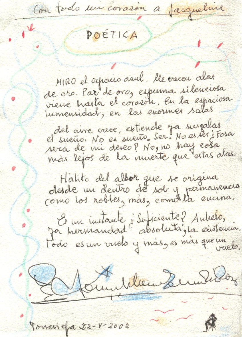 Los siete poemas han sido seleccionados por el poeta Alfredo Pérez Alencart de la antología ‘Elegía en el alto de Palomares’ (Difácil, Valladolid, 2015), que Tundidor dedicó a Jacqueline Alencar, haciendo en Salamanca las 20 ilustraciones interiores, durante la noche y madrugada del 7 al 8 de octubre de 2015, cuando se celebró el XVIII Encuentro de Poetas Iberoamericanos. También se publica el manuscrito del poema ‘Poética’, dedicado a Jacqueline Alencar en 2002.