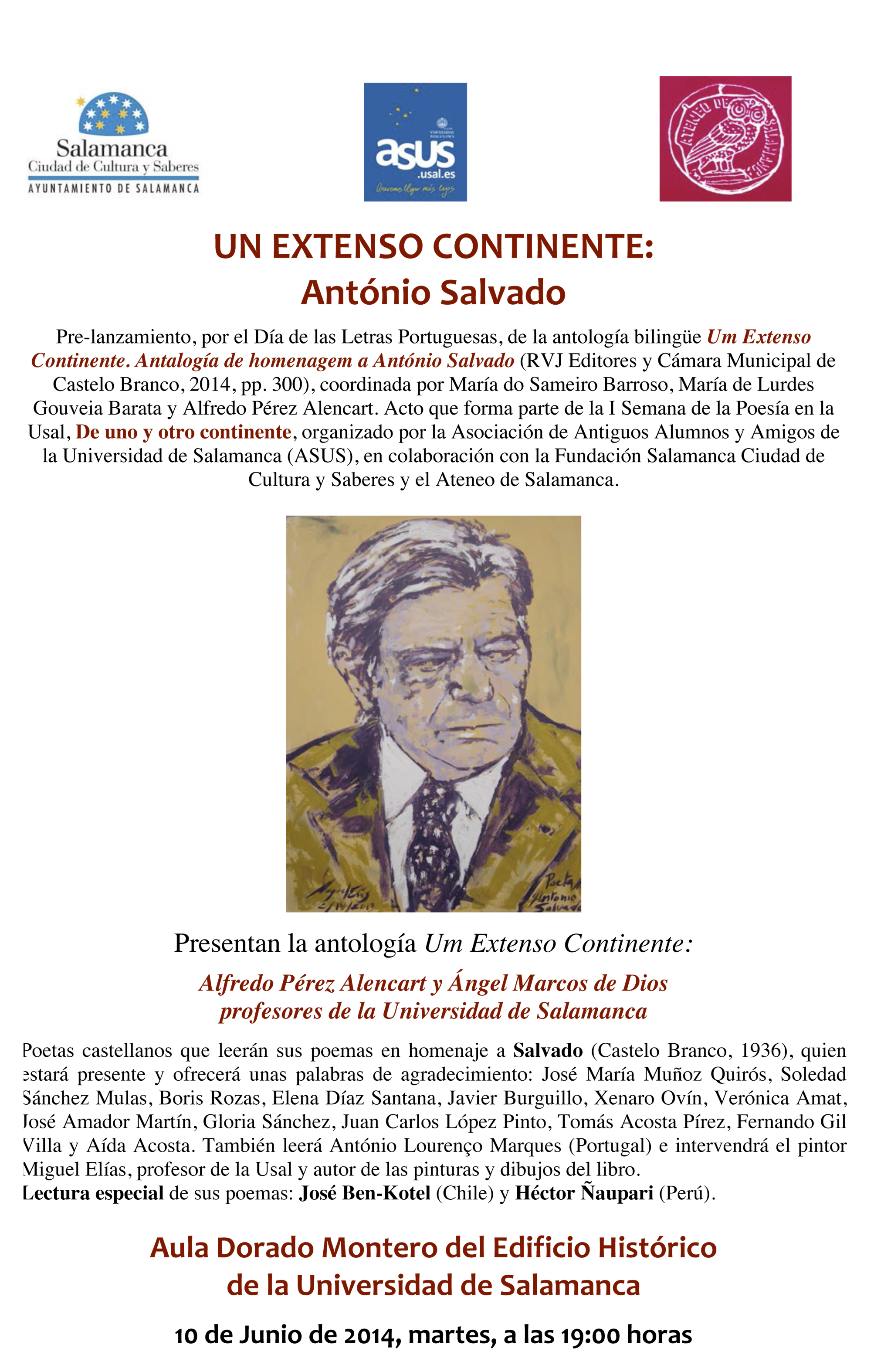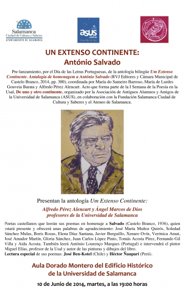 Presentación de la antología UM EXTENSO CONTINENTE. Homenagem ao poeta António Salvado (Poetas de Portugal, España y América Latina). Coordinación de Maria do Sameiro Barroso, Maria de Lurdes Barata y Alfredo Pérez Alencart. Y también lectura de Héctor Ñaupari (Perú) y José Ben-Kotel (Chile)