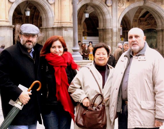 Alencart, Jacqueline Alencar, Iraida Páez y Viloria, en la Plaza Mayor de Salamanca (foto de José Amador Martín, 2015)