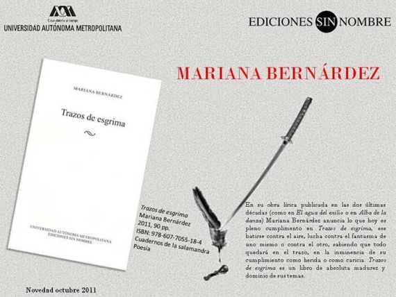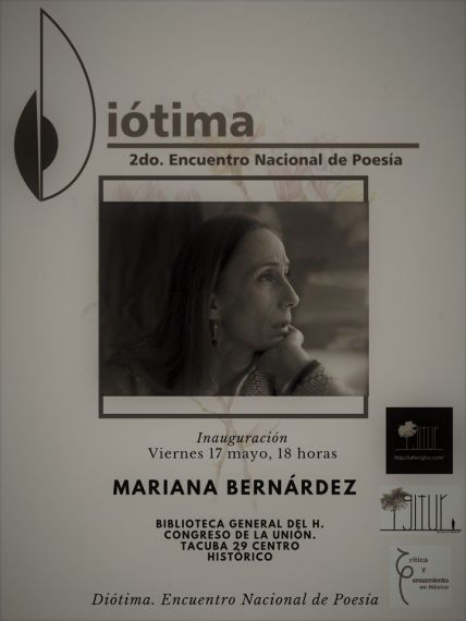 Crear en Salamanca tiene la satisfacción de publicar unos textos de Mariana Bernárdez (México DF, 1964). Realizó estudios de posgrado en Letras Modernas y en Filosofía. Entre sus libros de ensayo se encuentran Todo está en la línea: conversaciones con Raúl Renán y 15 poemas inéditos (2008); Ramón Xirau: hacia el sentido de la presencia (2010); Dolores Castro: crecer entre ruinas (2015. En poesía ha publicado Tiempo detenido (1987), Rictus (1990), Nostalgia de vuelo (1991), Luz derramada (1993), El agua del exilio (1994), Incunable (1996), Liturgia de águilas (2000), Alba de danza (2000), Sombras del fuego (2000), Simetría del silencio (2009.), Alguna vez el ciervo (2010), Trazos de esgrima (2011), Escríbeme en los ojos ( 2013. traducido al portugués por Nuno Júdice, Lisboa, Glaciar, Casa da América Latina y Ecochoice, 2015), Nervadura del relámpago (2013), En el pozo de mis ojos (2015) y Aliento (2017. Hay edición portuguesa, de 2018). Su poesía ha sido traducida al inglés, italiano, portugués y catalán.
