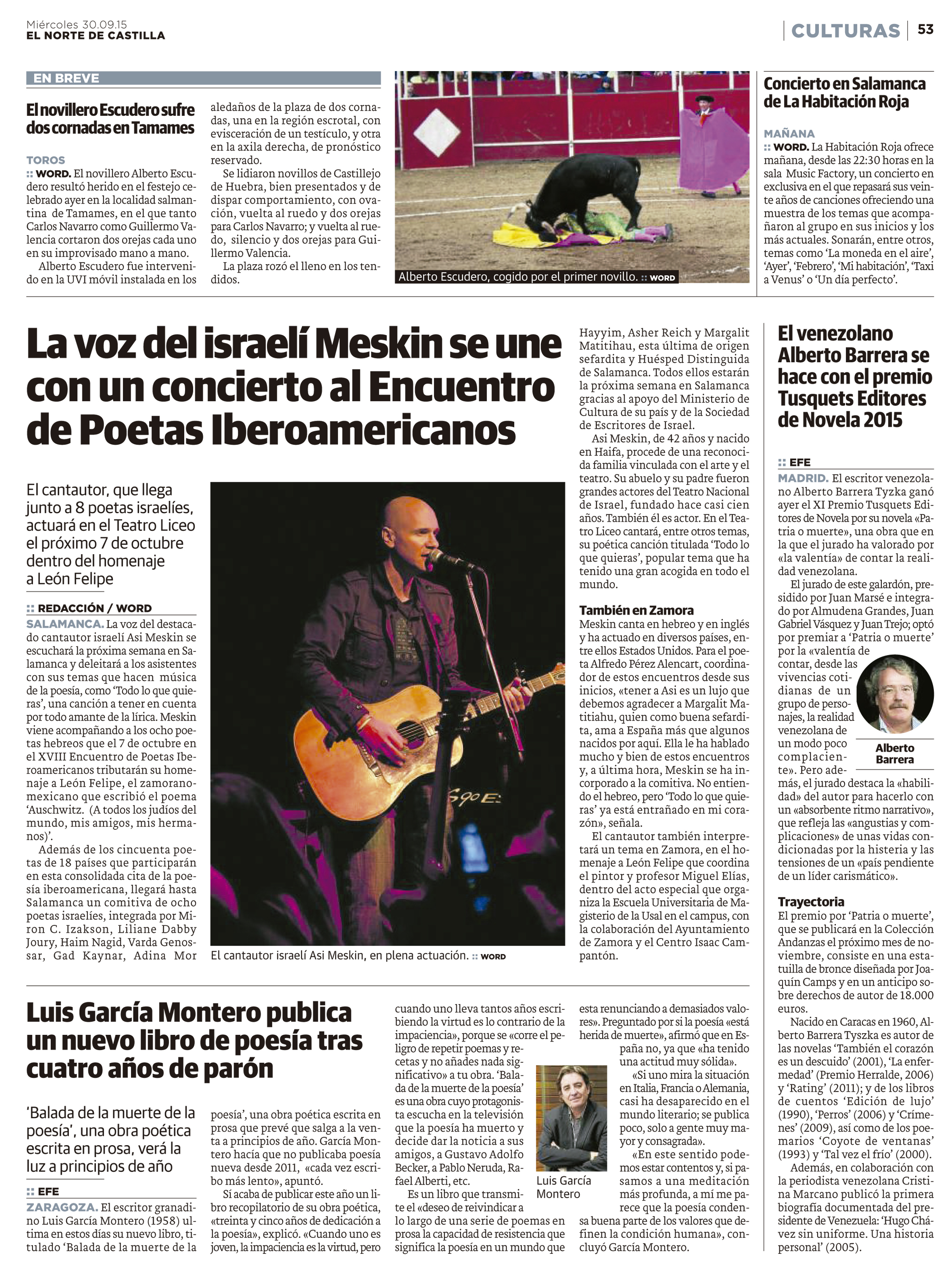 La voz del destacado cantautor israelí Asi Meskin se escuchó en Salamanca y deleitó a los asistentes con sus temas que hacen música de la poesía, como “Todo lo que quieras”, una canción a tener en cuenta por todo amante de la lírica. Meskin vino acompañando a los poetas Miron C. Izakson, Haim Nagid, Varda Genossar, Gad Kaynar, Adina Mor Hayyim, Asher Reich y Margalit Matitihau, que tributaron su homenaje a León Felipe, el zamorano-mexicano que escribió el poema ‘Auschwitz. (A todos los judíos del mundo, mis amigos, mis hermanos)’. Asi Meskin, de 42 años, procede de una reconocida familia vinculada con el arte y el teatro. Su abuelo y su padre fueron grandes actores del Teatro Nacional de Israel, fundado hace casi cien años. También él es actor. En el Teatro Liceo cantó, entre otros temas, su poética canción titulada ‘Todo lo que quieras’.
