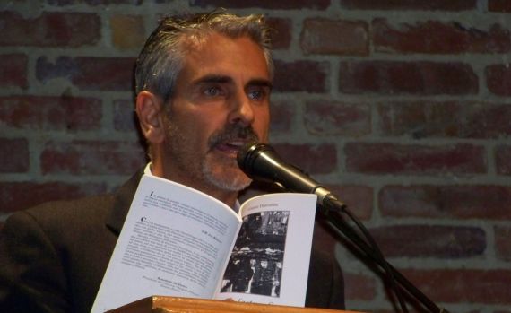El poeta portugués Victor Oliveira Mateus leyendo en el Teatro Liceo (Foto de José Amador Martín)