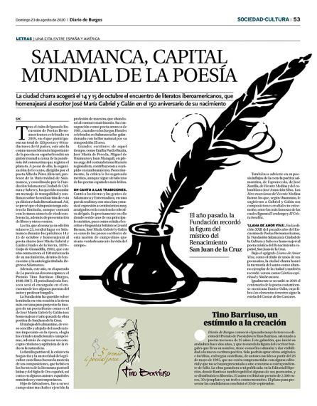 Poetas y amigos(as) de la Poesía y de la Salamanca cultural: Envío este nuevo boletín. El anterior comprendía hasta el 14 de agosto. Recuerdo que todos aquellos poetas que hayan participado en alguna de las veintitrés ediciones de estos encuentros pueden enviar sus noticias para difundirlas entre los aproximadamente 3,000 poetas y lectores de ambas riberas del español y el portugués que reciben, en diversos envíos, este Boletín. El envío a Salamanca debe ser de enlaces digitales o noticias de periódicos en JPG o PDF; no los programas, carteles, etc.). Esta invitación se añade ahora a los poetas que hayan sido finalistas de las siete ediciones del Premio Internacional de Poesía ‘Pilar Fernández Labrador’, de las seis ediciones del Premio Internacional Francisco de Aldana de Poesía en Lengua Castellana, convocado desde Nápoles, y de las primeras ediciones del Premio Internacional de Poesía António Salvado-Ciudad de Castelo Branco, así como del Premio Rey David de Poesía Bíblica Iberoamericana.