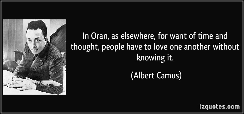 “…no es necesario especificar la manera de amar que se estila. Los hombres y mujeres o bien se devoran rápidamente en eso que se llama el acto del amor, o bien se crean el compromiso de una larga costumbre a dúo. Entre estos dos extremos no hay término medio. Eso tampoco es original. En Orán, como en otras partes, por falta de tiempo y de reflexión, se ve uno obligado a amar sin darse cuenta”.