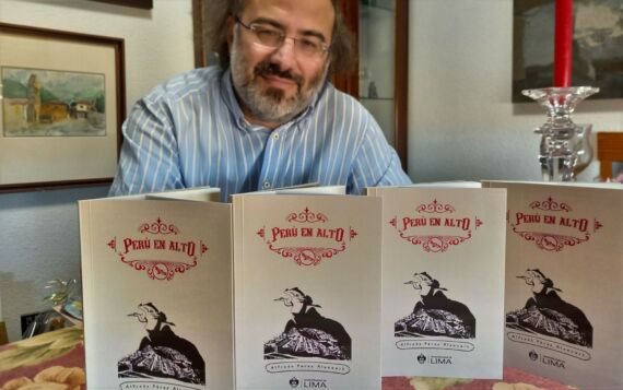 Alfredo Pérez Alencart con ejemplares impresos de su antología ‘Perú en alto’ (foto de José Iuris)