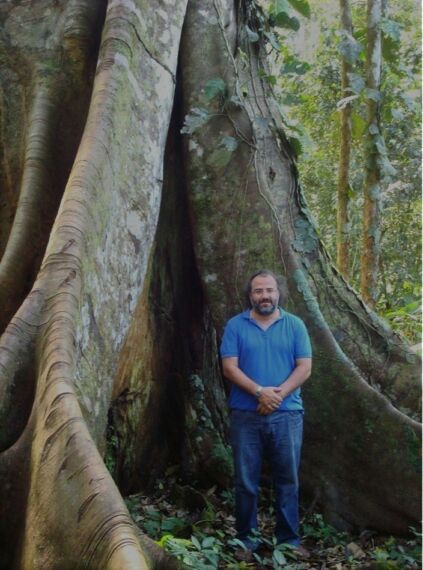 A. P. Alencart entre las aletas de un árbol de lupuna ( Foto de Jacqueline Alencar)