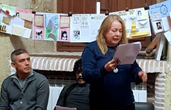 Macarena Barahona leyendo en castellano el poema de Lana Derkak en el Colegio Maestro Ávila