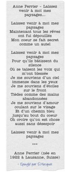 Anne Perrier nació en Lausanne, Suiza, en 1922; falleció en 2017. Poetisa de lengua Francesa. Su primer libro data de 1952: Selon la nuit.  Entre esta fecha y 1994, publica: Pour un vitrail; Le Voyage; Le Petit Pré; Le temps est mort ; Lettres perdues; Feu les oiseaux; le Livre d’Ophélie ; La Voie nomade ; Les Noms de l’arbre; Le joueur de flûte. En 2012 fue distinguida con el Gran premio nacional de poesía en Francia, concedido por el Ministerio de la Cultura. Su poesía ha sido traducida al Albanés, Alemán, Castellano, Chino, Italiano, Japonés, Rumano, Polaco, Portugués y en lengua vietnamita.