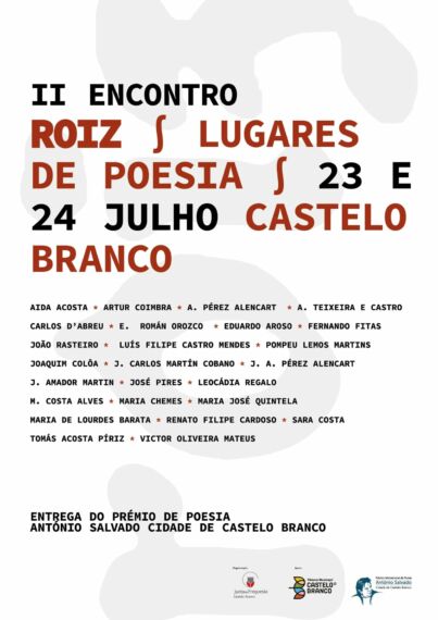 Crear en Salamanca tiene el privilegio de difundir, calidad de primicia, algunos poemas del libro QUE OBTUVO LA Mención de Honor (en lengua portuguesa) del II Premio Internacional de Poesía António Salvado-Ciudad de Castelo Branco. La ceremonia de premiación se hizo dentro del marco del II ENCUENTRO ROIZ DE POESÍA MÚSICA, celebrado el 23 y 24 de julio en la ciudad lusitana de Castelo Branco. Este evento, organizado por la Junta de Freguesia de Castelo Branco, presidida por Leopoldo Rodrigues, se realiza con periodicidad bienal y se complementa con la entrega del Premio Internacional de Poesía António Salvado – Ciudad de Castelo Branco. Los poetas portugueses que estuvieron invitados fueron Maria de Lourdes Barata, Leocádia Regalo, Sara Costa, Maria José Quintela, Antonio Teixeira e Castro, Pompeu Martins, Joaquim Colôa, Carlos D’Abreu, Manuel Costa Alves, José Pires, Luís Filipe Castro Mendes, João Rasteiro y Artur Coimbra. Por su parte, los poetas salmantinos o vinculados con Salamanca son: José Amador Martín, José Alfredo Pérez Alencar, Tomás Acosta Pires, Aída Acosta, Juan Carlos Martín y A. P. Alencart. También estuvieron presentes los galardonados en idioma portugués: el Fernando Fitas (Premio) y Renato Filipe Cardoso (Mención de Honor). Por vía online leyeron sus poemas el venezolano Ernesto Román Orozco, ganador en lengua española, y la argentina María Chemes, accésit. La idea y coordinación del Encuentro tiene en Pedro Salvado a una referencia ineludible.