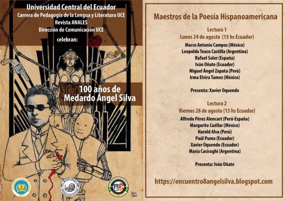 Estos cuatro poemas serán leídos esta noche, hora española, en el recital “Maestros de la Poesía Hispanoamericana”, que está organizado por la revista Anales, la Carrera de Pedagogía de Lengua y Literatura de la Facultad de Filosofía y Letras de la Universidad Central del Ecuador, así como la Dirección de Comunicación de dicha universidad, dentro del VIII Congreso Internacional de Docentes de Lengua y Literatura, dedicado a celebrar el entenario del poeta Medardo Ángel Silva y que se realizará de forma virtual desde hoy hasta el 28 de agosto