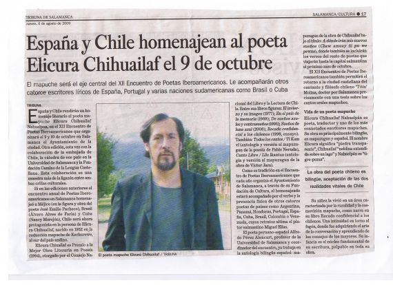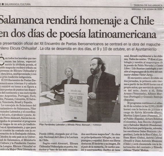 POEMAS DEL MAPUCHE ELICURA CHIAHUAILAF, RECIENTE PREMIO NACIONAL DE LITERATURA DE CHILE, HOMENAJE EN SALAMANCA EN 2009