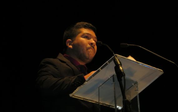 Javier Alvarado leyendo sus versos en el Teatro Liceo de Salamanca (foto de Jacqueline Alencar)