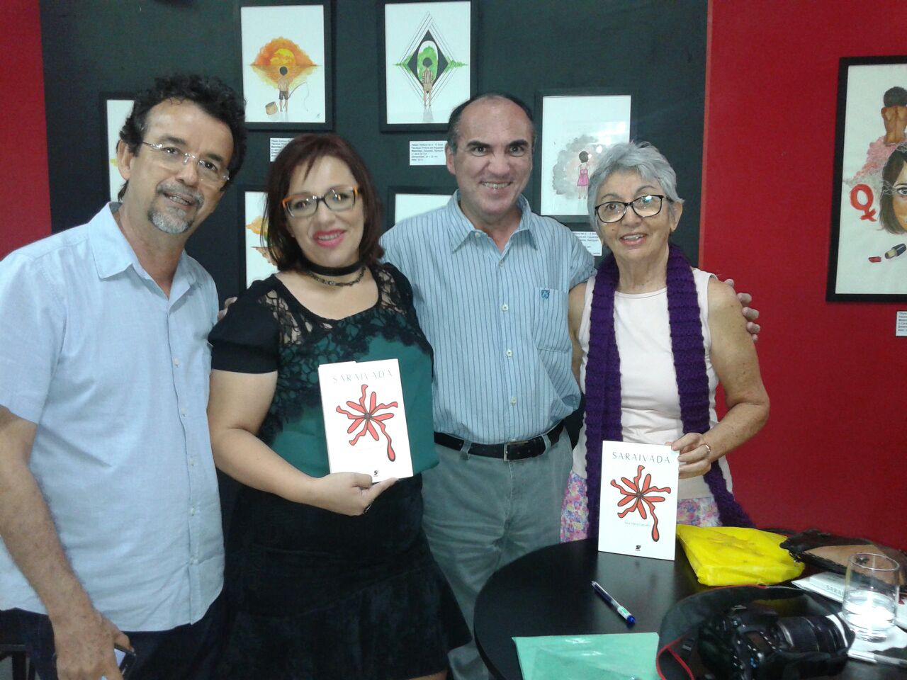 Rizolete Fernandes junto al poeta David Leite y otros dos escritores nordestinos