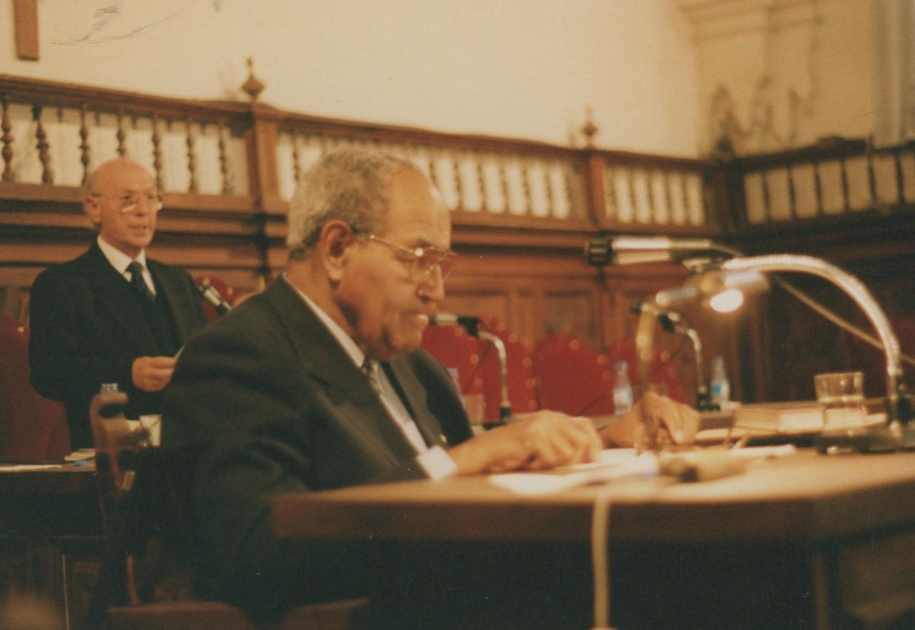 Gastón Baquero y Alfonso Ortega, en el Aula Magna de la Pontificia (1993, foto de A. P. Alencart)