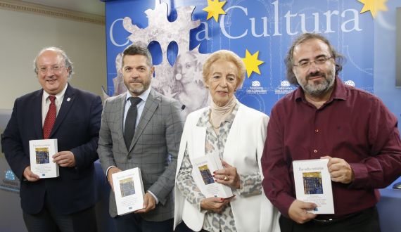 Enrique Cabero, Julio López Revuelta, Pilar Fernández Labrador y Alfredo Pérez Alencart, con la antología (foto de José Amador Martín)