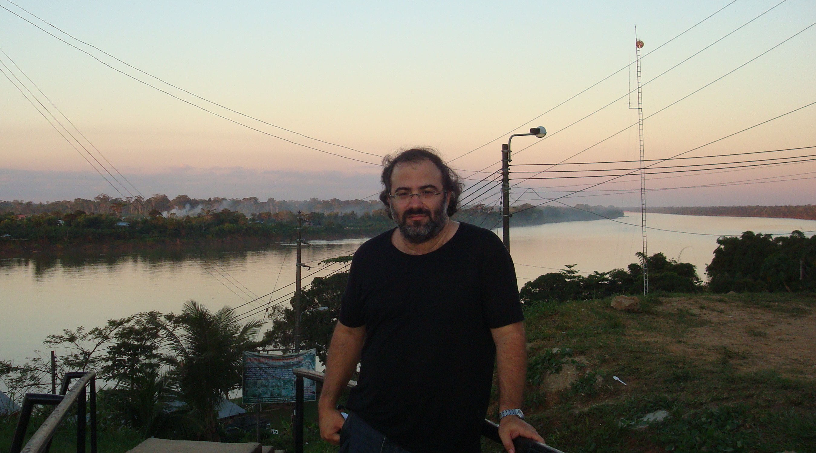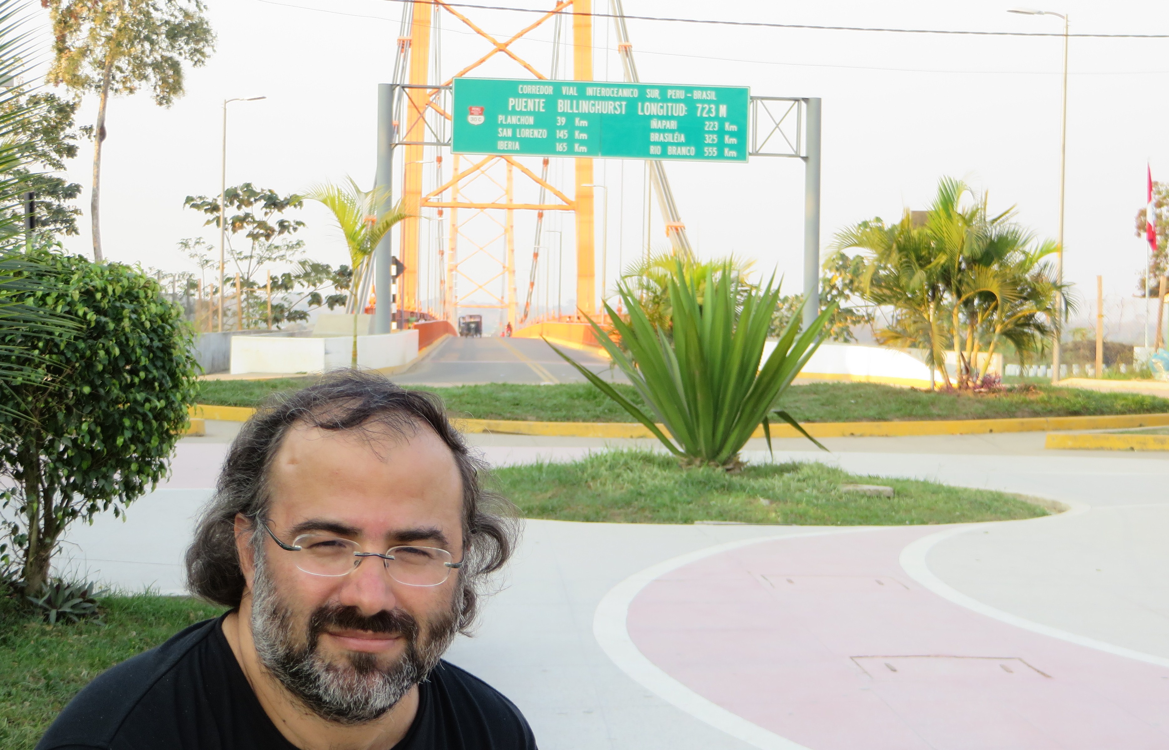 Alfredo Pérez Alencart ante el puente que une las dos orillas del río Madre de Dios o Amarumayo (2014)