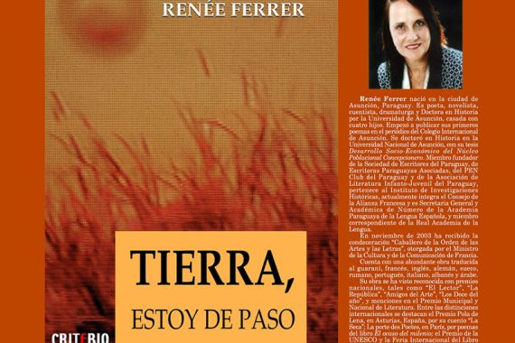Crear en Salamanca tiene la satisfacción de publicar estos diez poemas de Renée Ferrer (Asunción, 1944), destacada poeta, novelista, cuentista, dramaturga, escritora de literatura infantil. Doctora en Historia por la Universidad Nacional de Asunción. Fundadora de la Sociedad de Escritores del Paraguay, la Asociación de Literatura Infantojuvenil del Paraguay y Escritoras Paraguayas Asociadas. Presidenta de la Sociedad de Escritores del Paraguay, 1997-1998. Presidenta de la Academia Paraguaya de la Lengua Española desde 2011 hasta 2017. Entre sus poemarios están: Hay surcos que no se llenan (1965), Voces sin réplica (1967), Cascarita de nuez (1978), Desde el cañadón de la memoria (1982), Galope (1983), Campo y cielo (1985), Peregrino de la eternidad y Sobreviviente (1985), Nocturnos (1988), Viaje a destiempo (1989), De lugares, momentos e implicancias varias (1990), El acantilado y el mar (1992) y El resplandor y las sombras (1996), entre otros. Ha sido incluida en numerosas antologías de poesía y narrativa.