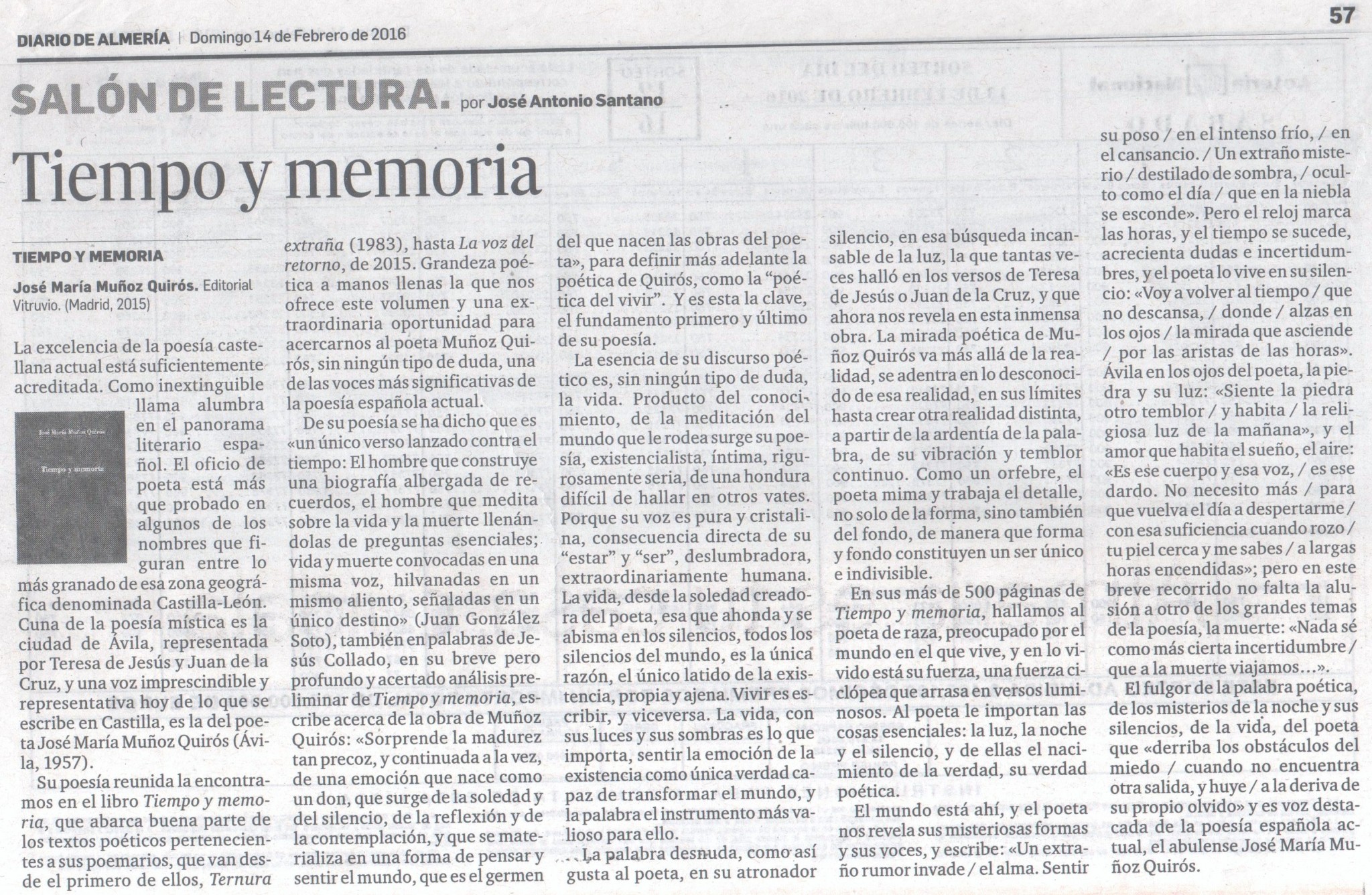“Y todo reaparece en la memoria entre luces, sombras, misterios de lo evidente, niebla, desconsuelo, desolación; recurrencias a San Juan de la Cruz que tanto sabía de cosas vividas y olvidadas entre ráfagas de desmemoria diluidas en el tiempo. Es este libro aparentemente sereno. Amargo en lo hondo. Hermoso sin afeites. Es pura desnudez del espíritu” JOSÉ HIERRO. 2000.