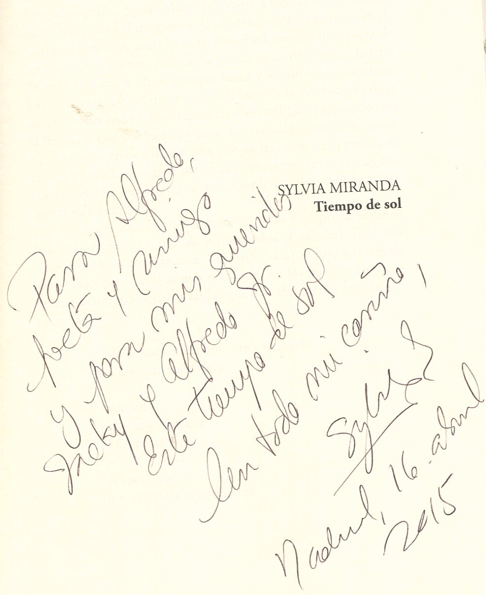 Conozco a Sylvia Miranda desde hace más de cinco lustros. En Lima ella estudió Derecho en la misma Universidad que yo, aunque algunos años después. Luego, la fuerza de su pasión literaria, la trajo a Salamanca, donde hizo la licenciatura en Filología y conoció a su esposo, el pintor francés Sylvain Mâlet. Ahora vive en Madrid, en cuya Universidad Complutense obtuvo el Doctorado, y de donde me hizo llegar su Tiempo de sol (Huesos de jibia, Buenos Aires, 2014, con prólogo de Carmen Ollé), un libro de arranque, maduro, donde el canto no engulle a la Poesía. En él acumula textos inéditos o ya publicados en forma de plaqueta. Por ello contiene múltiples registros, de los cuales he elegido fragmentos de la primera parte, más de savia amorosa, sumando un poemita que lleva a Salamanca en el título. Me alegra y conmueve que lo suyo no sea una voz que sopla a las velas plegadas, como sucede con demasiada frecuencia en esa poesía ‘femenina’ tan manoseada.