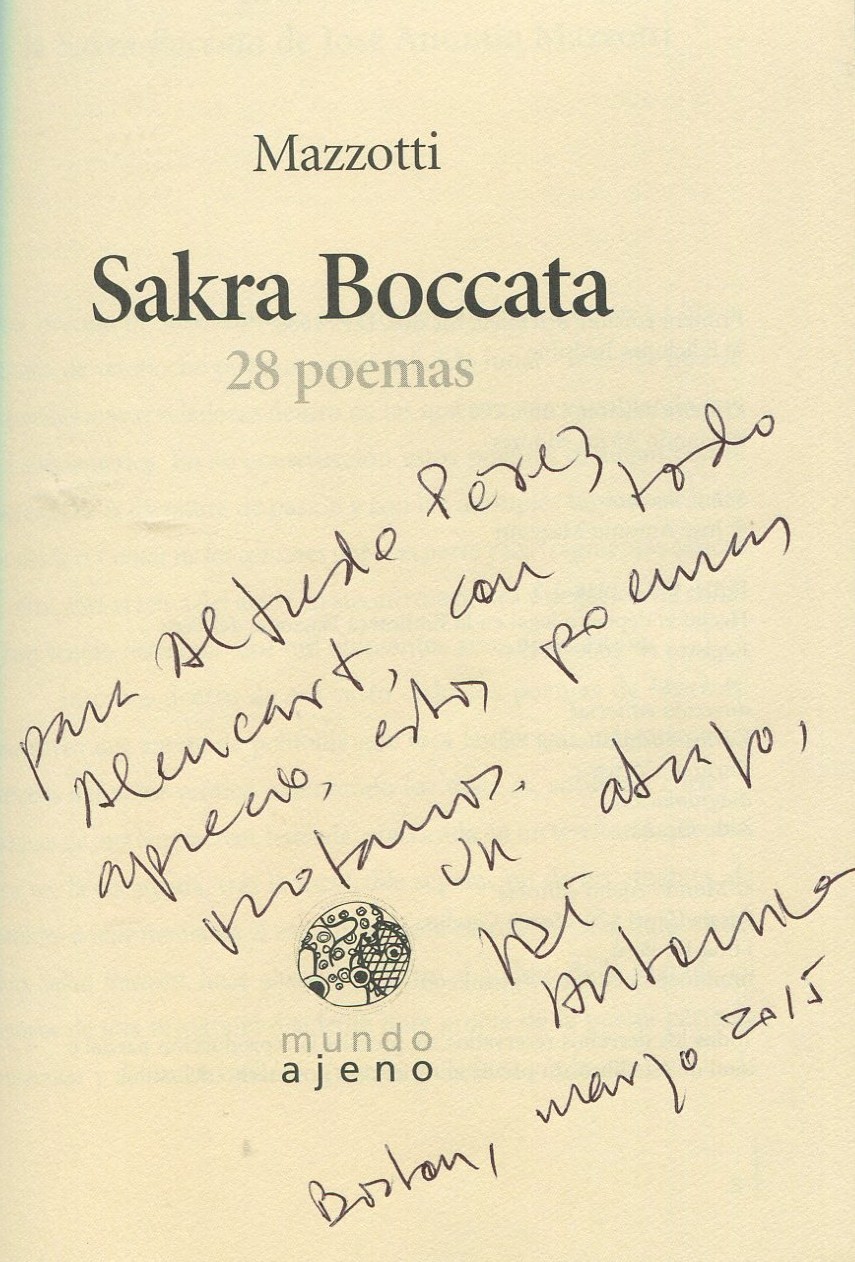 En las últimas semanas he recibido muchos libros, especialmente de América, España y Portugal. Cierto que Brasil está en lo más alto del escalafón, por los numerosos poemarios o novelas, relatos y crónicas que llegan hasta mi morada del Tormes. Pero ahora espigo tres de ellos con impronta peruana y también preñados por Eros: Uno me llegó desde Boston, donde vive y trabaja y acumula saudades José Antonio Mazzotti: su “Sakra Boccata” (Ajeno Mundo, Lima, 2007) tiene un contundente prólogo de Raúl Zurita, buen amigo y mejor poeta. Y si los tres bardos orbitan, en esta selección de su obra que he acopiado para Crear en Salamanca, la llama que nos desmuere, de cierto que esta obra de Mazzotti ejemplifica que el eros es sagrado. Y si alguien, beato o no, pretende objetar esta sentencia, sólo habría que remitirle al Cantar de los Cantares (para .los creyentes) y a “Sakra bocatta” (para los insumisos al Verbo que se hizo carne).