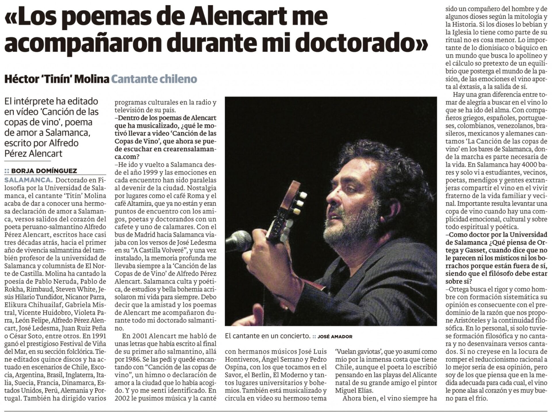 Crear en Salamanca tiene el privilegio de dar a conocer, por vez primera en la Red, el video del poema ‘Canción de las copas de vino’, escrito por Alfredo Pérez Alencart y cantado por el destacado músico chileno Héctor ‘Titín’ Molina, doctor en Filosofía por la Universidad de Salamanca y ganador del Festival de Viña del Mar (género folclórico) en 1991. Agradecemos a Borja Domínguez por cedernos parte de la entrevista que hizo al cantante chileno y que ha preparado para El Norte de Castilla, el periódico decano de España y donde colabora el poeta Alfredo Pérez Alencart, profesor de la universidad de Salamanca.