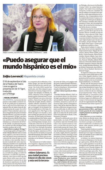 Crear en Salamanca se complace en publicar la entrevista que el periodista Miguel Rituerto acaba de hacer a Zeljka Lovrencic y que apareció en la edición salmantina de El Norte de Castilla. La misma gira en torno a la valiosa labor de traducción que realiza Lovrencic tanto con los escritores de habla hispana, traduciéndolos al croata, como sus traducciones al español de los poetas croatas, ahora especialmente centrada en el poemario ‘El tigre’, de Tomislav Marijan Bilosnić, que se presentará en Salamanca el 16 de septiembre la Sala de la Palabra del Teatro Liceo.